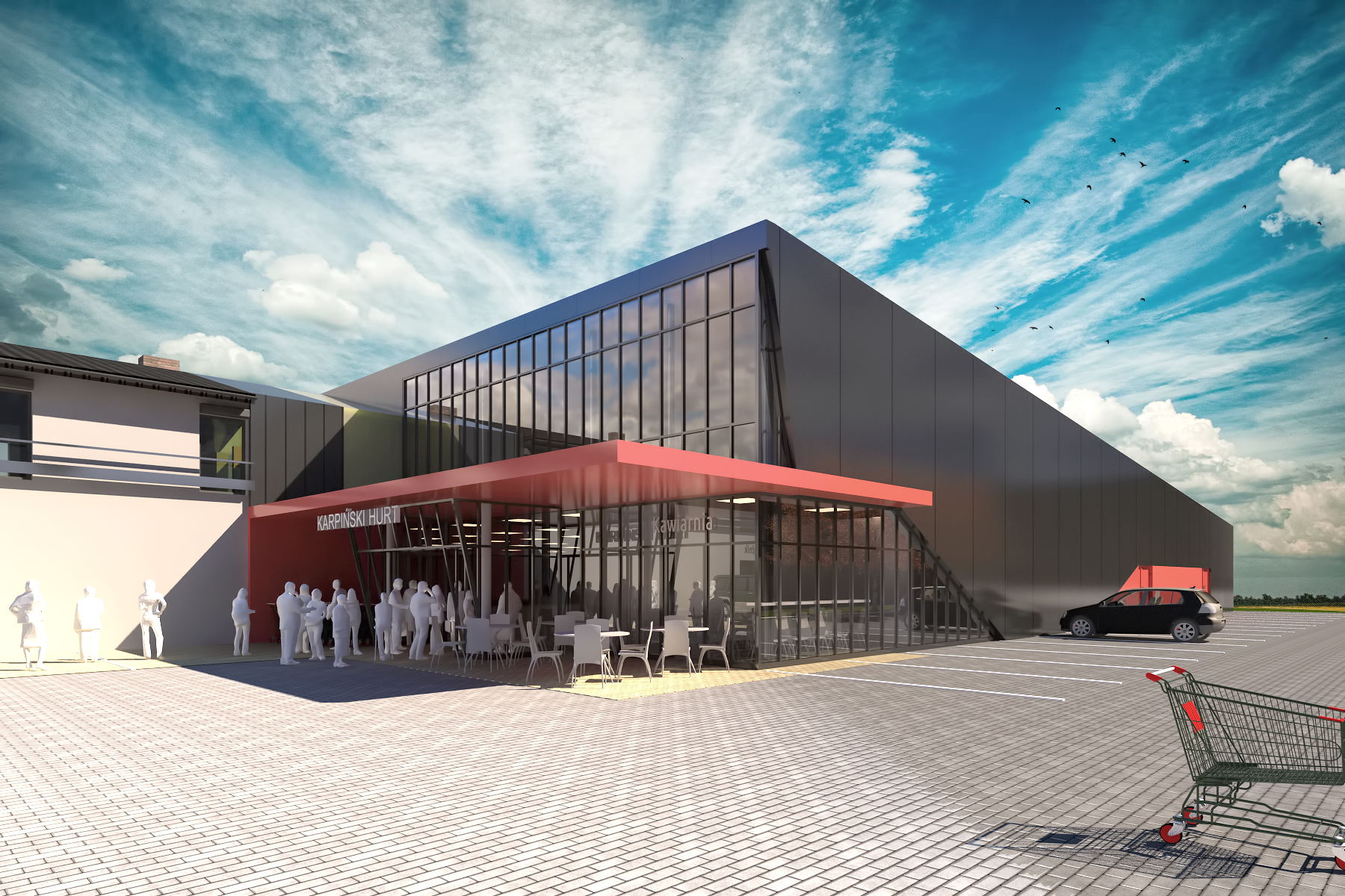 W większości przypadków parki handlowe powstają w ramach lokalnych, a najczęściej – ogólnopolskich sieci. W Imielinie potrzeba budowy takiego obiektu została podyktowana ogromnym popytem na asortyment inwestora, który działa od lat w branży mięsnej. Stale rosnący napływ lokalnych mieszkańców i odbiorców hurtowych do projektowanego przez Michała Konarzewskiego jeszcze w 2012 r. sklepu przyczynił się do wykorzystania potencjału tego miejsca i w 2018 roku inwestor zwrócił się z prośbą o sporządzenie projektu rozbudowy. Po upływie sześciu lat możemy poinformować o przystąpieniu do realizacji parku handlowego w Imielinie, który oprócz podstawowej działalności inwestora pomieści do dziesięciu innych lokali handlowych i usługowych. Pod względem projektowym warto zauważyć, iż obiekt ten znajduje się na terenie górniczym kategorii 1, co wymusza stosowanie odpowiednich zabezpieczeń oraz wiąże się z konieczności poczynienia uzgodnień z kopalnią.